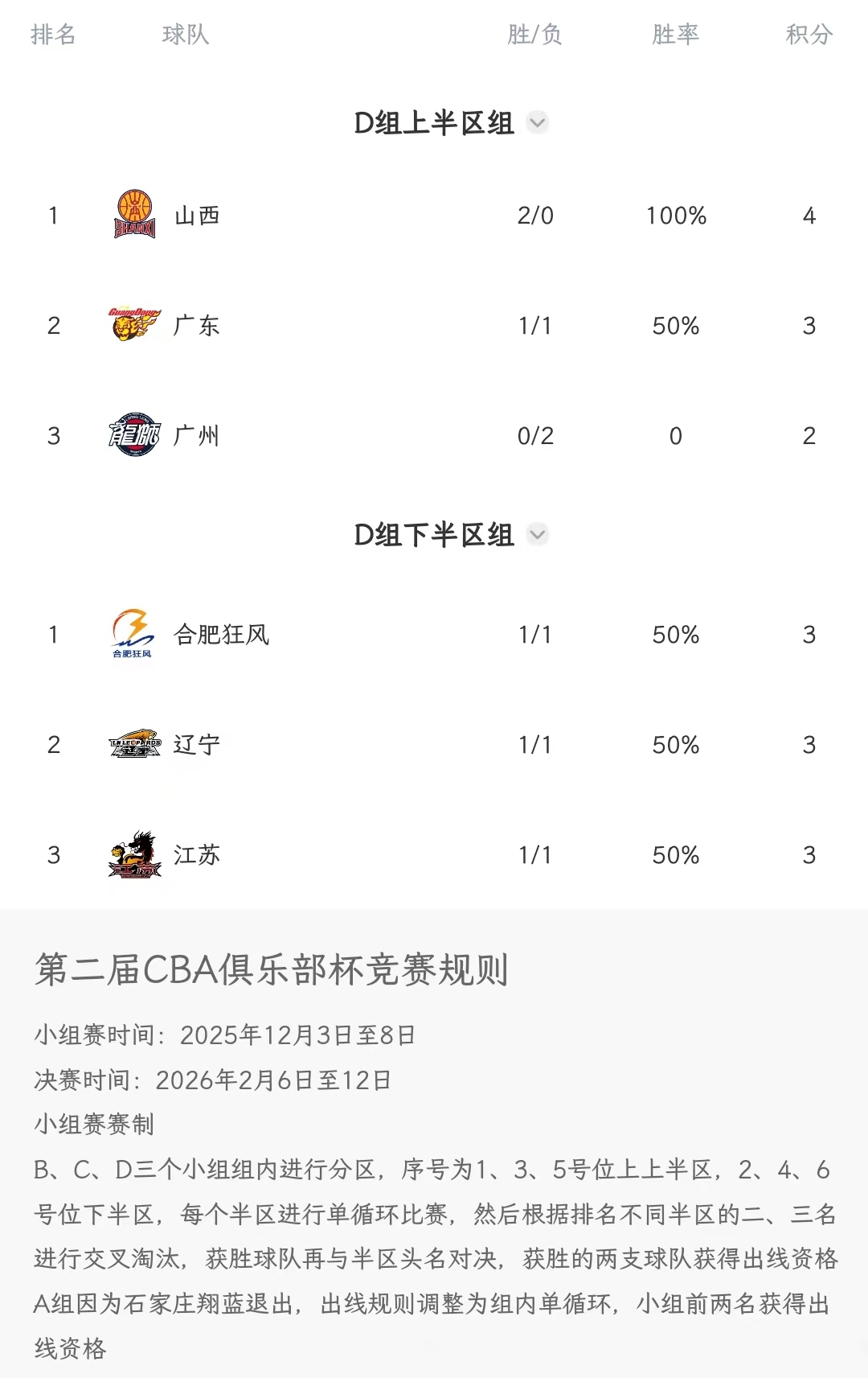 D组【上半区:1、山西2胜;2、广东1胜1负;3、广州2负】,【下半区:1、合肥1胜1负净胜9分;2、辽宁1胜1负净胜4分;3、江苏1胜1负净胜-13分】