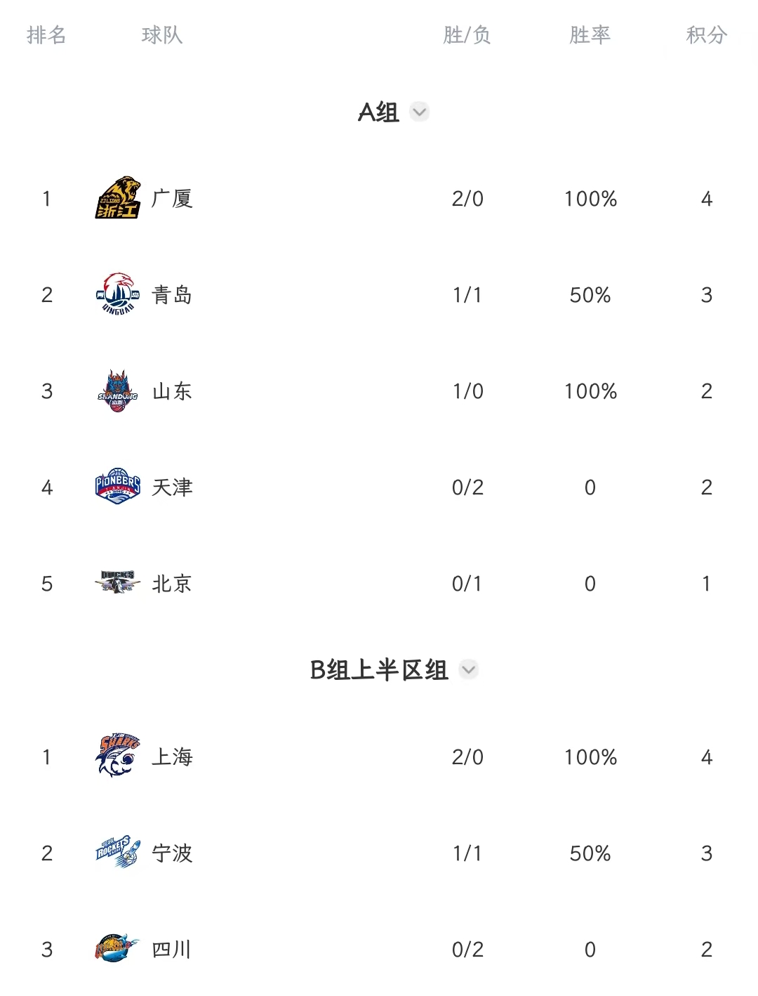 排名为A组:广厦2胜;青岛1胜1负;山东1胜,天津2负;北京1负。