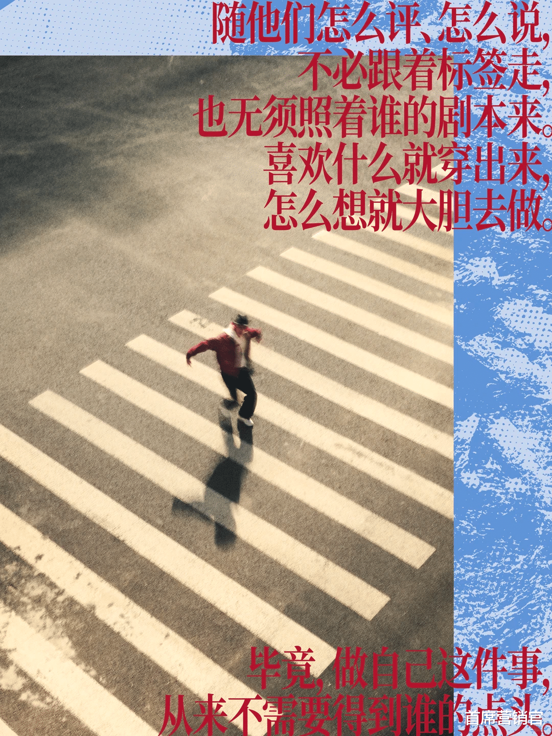 针对被生活压力困住的普通大众,文案没有喊空洞的口号,而是给出了具体的行动指引。这句话的高明之处在于,它将“脱缰”的宏大概念转化为“迈步、呼吸”等微小的行动,消解了用户对“突破”的畏惧心理,同时将运动与“自我救赎”绑定,让品牌理念变得可触摸、可执行。而对于被标签束缚的年轻人,文案则直击痛点:随他们怎么评、怎么说,不必跟着标签走,也无须照着谁的剧本来。喜欢什么就穿出来,怎么想就大胆去做。毕竟,做自己这件事,从来不需要得到谁的点头。