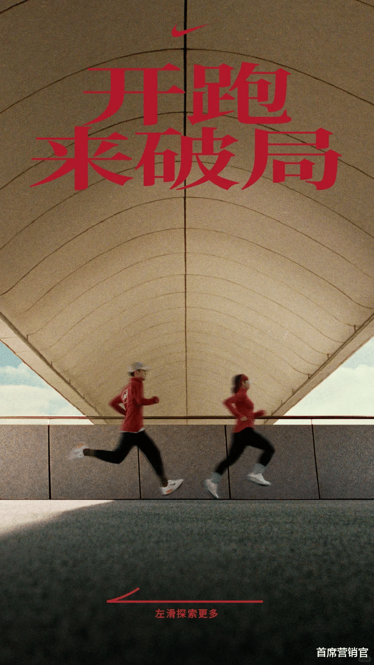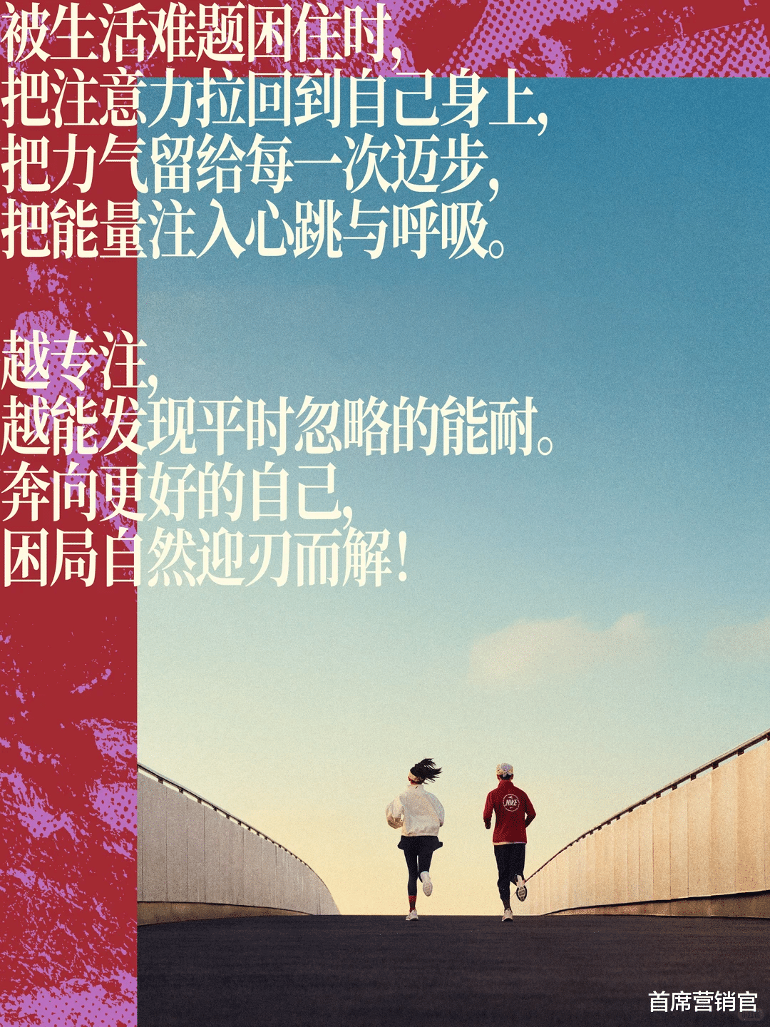 “脱缰"二字精准捕捉了马年的文化内核——马在中国传统文化中象征着自由、奔放、不受束缚,这与耐克"Just Do It"的品牌精神高度契合。文案没有停留在产品功能的描述,而是将产品与精神价值深度绑定,让消费者购买的不仅是一双鞋,更是一种"破局"的态度。系列的开篇文案,如同品牌的定调宣言:被生活难题困住时,把注意力拉回到自己身上,把力气留给每一次迈步,把能量注入心跳与呼吸。越专注,越能发现平时忽略的能耐。奔向更好的自己,困局自然迎刃而解!