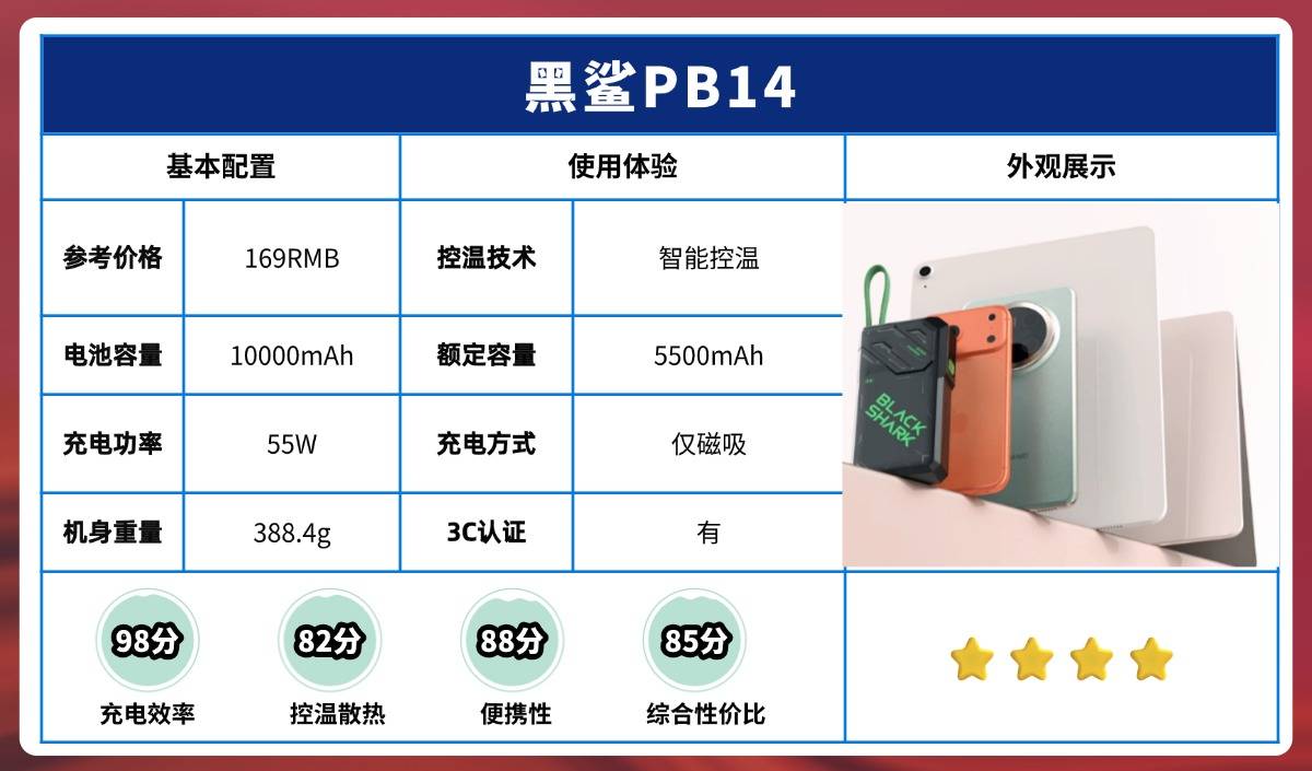这款黑鲨 PB14 充电宝,机甲风的外壳真的超有辨识度,拿在手里一眼就能和普通款区分开。尺寸是长 134mm、宽 73mm、高 27.5mm,净重 388.4g,塞背包里完全没问题。