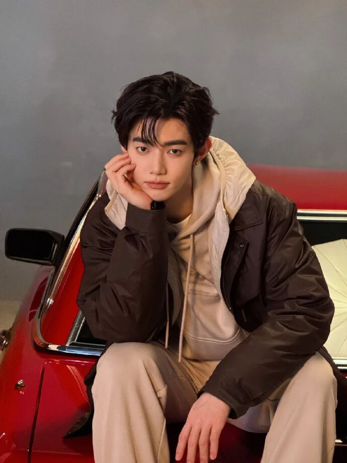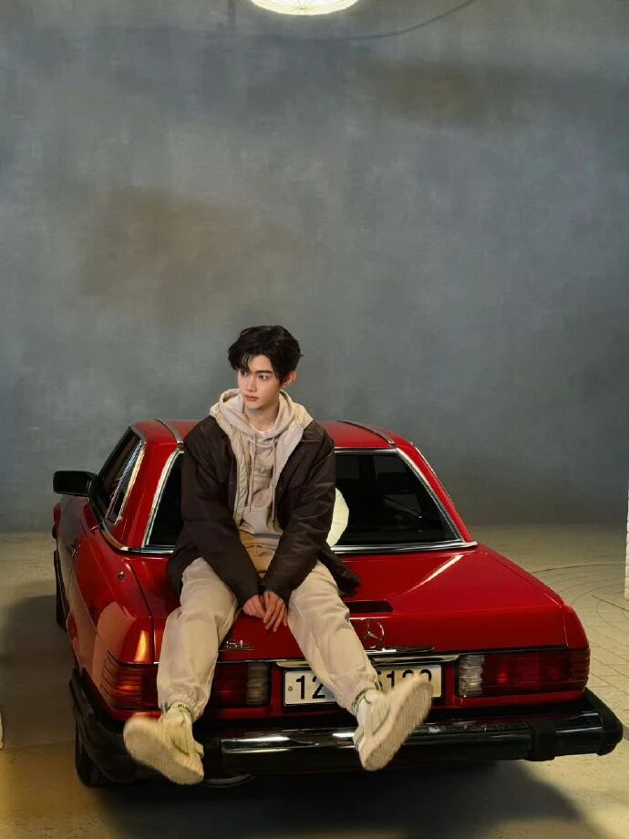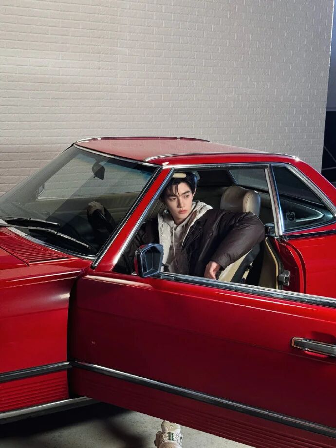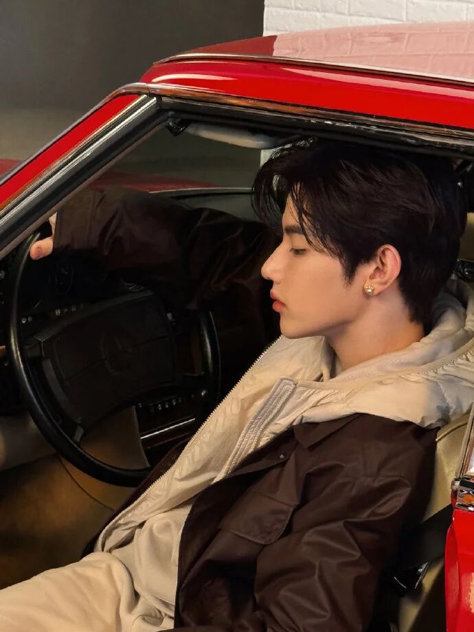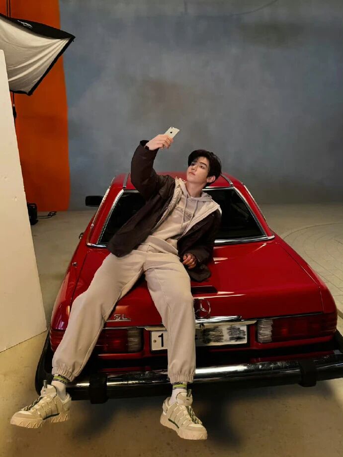 章昊这套 FILA FUSION 造型,直接把 “少年潮酷 + 松弛日常” 揉得恰到好处 —— 棕褐冲锋衣叠搭浅杏连帽衫,软质围巾松垮垂在颈间,浅卡其裤衬出清瘦腿型,再撞上复古红车的浓烈色调,他没把潮牌穿成刻意的 “酷盖标签”,而是用少年的清瘦骨相撑住单品的松弛感,让穿搭和红车场景自然融成一体,每帧画面都透着 “不费力的潮”。