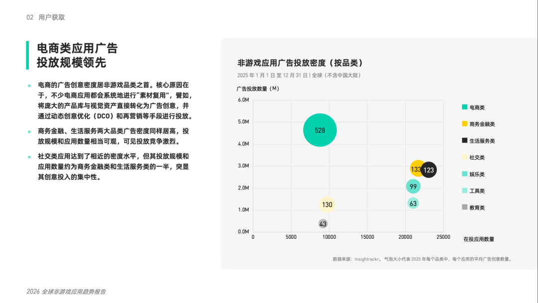 移动互联网的流量红利见顶已是老生常谈,但2025年的数据却告诉我们:结构性机会依然存在,只是藏得更深了。近日,Mintegral与Insightrackr联合发布的《2026年全球非游戏应用趋势报告》(下称“报告”)基于全年超100个市场的真实投放与变现数据,为我们勾勒出后ATT时代非游赛道的真实图景。本文将从双端格局、品类分化、区域差异及竞价策略演变四个维度,拆解这份报告的干货,并尝试为出海厂商提炼出可落地的策略支点。