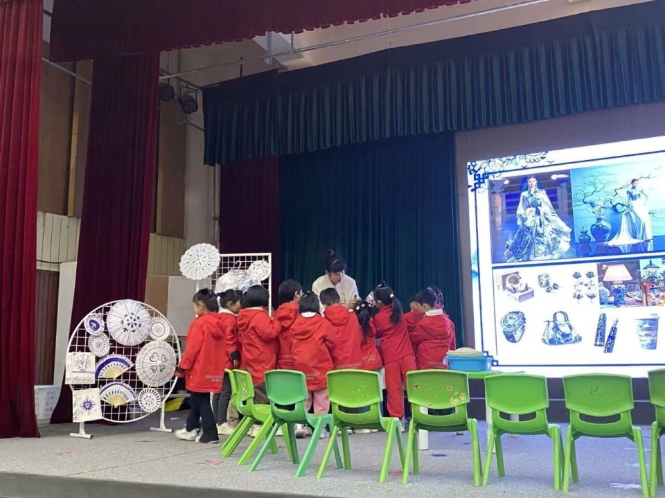 1. 道具赋能,打造沉浸式体验:精心创设“青花博物馆”情境,准备了青花瓷器实物、青花装饰生活中的纸杯、纸盘、纸盘、纸扇等道具。活动中,幼儿化身“小小探秘者”,通过看一看、摸一摸的方式,直观感受青花瓷的色彩美、纹样美与造型美,打破了传统艺术课“教师讲、幼儿听”的模式,让幼儿成为课堂的主角。