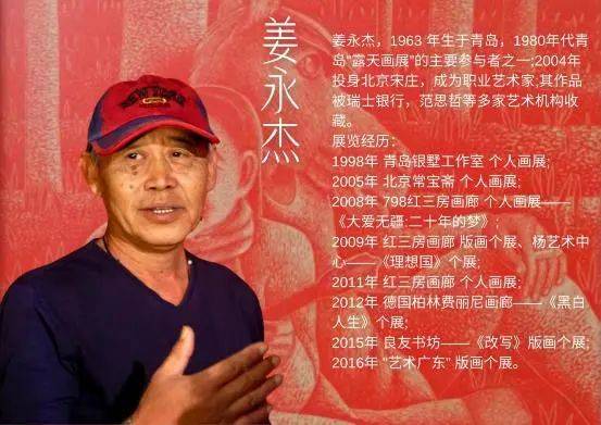 姜永杰,1963 年生于青岛,1980年代青岛"露天画展”的主要参与者之一;2004年投身北京宋庄,成为职业艺术家;其作品被瑞士银行,范思哲等多家艺术机构收藏。