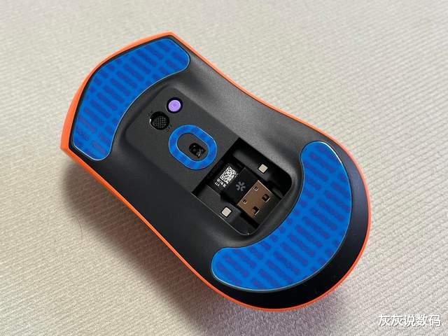 模具设计上,VT7在细节打磨上下足功夫。左右按键设有手指凹槽,急停甩枪时不易滑脱;侧键位置合理,拇指可轻松触及,且表面采用亲肤防滑涂层处理,按压稳定。值得注意的是,滚轮与DPI按键布局合理,后部保留标志性设计,操作直观。底部配备大面积脚贴,移动顺滑流畅,同时设有接收器收纳仓与自定义按键,实用性满分。接收器采用斜插式设计,插拔更便捷,带有电量指示灯,可随时知悉鼠标剩余电量。