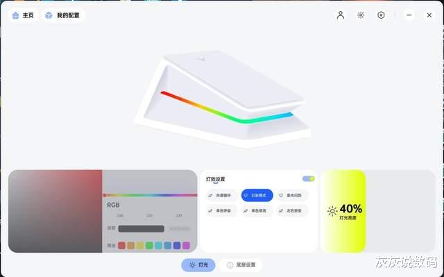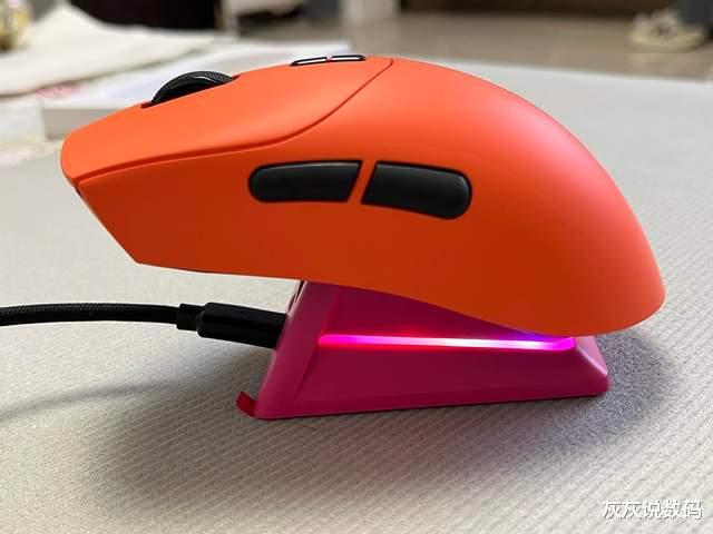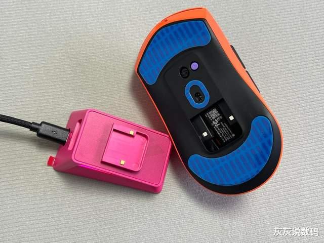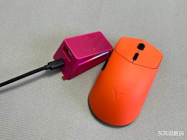 灰灰在充电的方式上,选择搭配了雷柏P5 PLUS触电充底座,树莓粉充电底座搭配焰影橙鼠标,视觉效果非常亮眼,磁吸触点充电设计,使用非常的方便,在电量不足时随手一放就能自动吸附充电,免去了反复插拔线缆的麻烦。而且充电时底座会亮起幻彩RGB灯光,通过按键或者A Hub驱动程序可自由切换多种光效,即便摆在桌上,也是一个不错的装饰点缀。