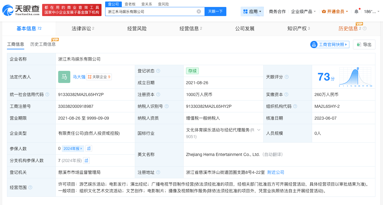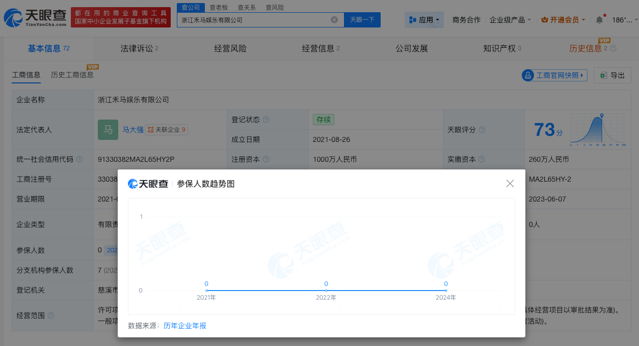 天眼查工商信息显示,禾马娱乐关联公司浙江禾马娱乐有限公司成立于2021年8月,法定代表人为马大强,注册资本1000万人民币,经营范围包括游艺娱乐活动、电影发行、演出经纪等。股东信息显示,该公司由马大强、宁波大白熊企业管理合伙企业(普通合伙)共同持股。年报信息显示,该公司多年参保人数为0。
