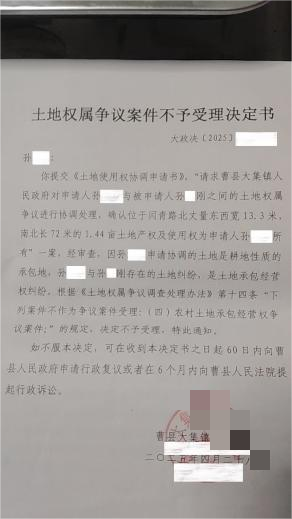 2025年4月28日,大集镇相关部门作出《土地权属争议案件不予受理决定书》,以争议土地为承包地、纠纷属农村土地承包经营权争议为由,决定对该申请不予受理。随后,孙先生向曹县人民法院提起民事诉讼,法院经审查认为,因涉案土地未取得权属证书,需先向相关部门申请确权,依据《最高人民法院关于审理涉及农村土地承包纠纷案件适用法律问题的解释》,认定其诉请不属于民事诉讼受理范围,未予立案。
