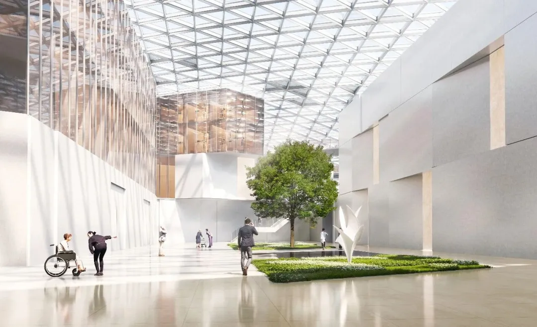 “飞碟”内部则汇聚前沿医疗与AI智慧,成为一处静谧而高效的生命驿站。与之相伴的,是一座半透明的双金字塔体验中心,作为用户、患者与访客的核心枢纽。