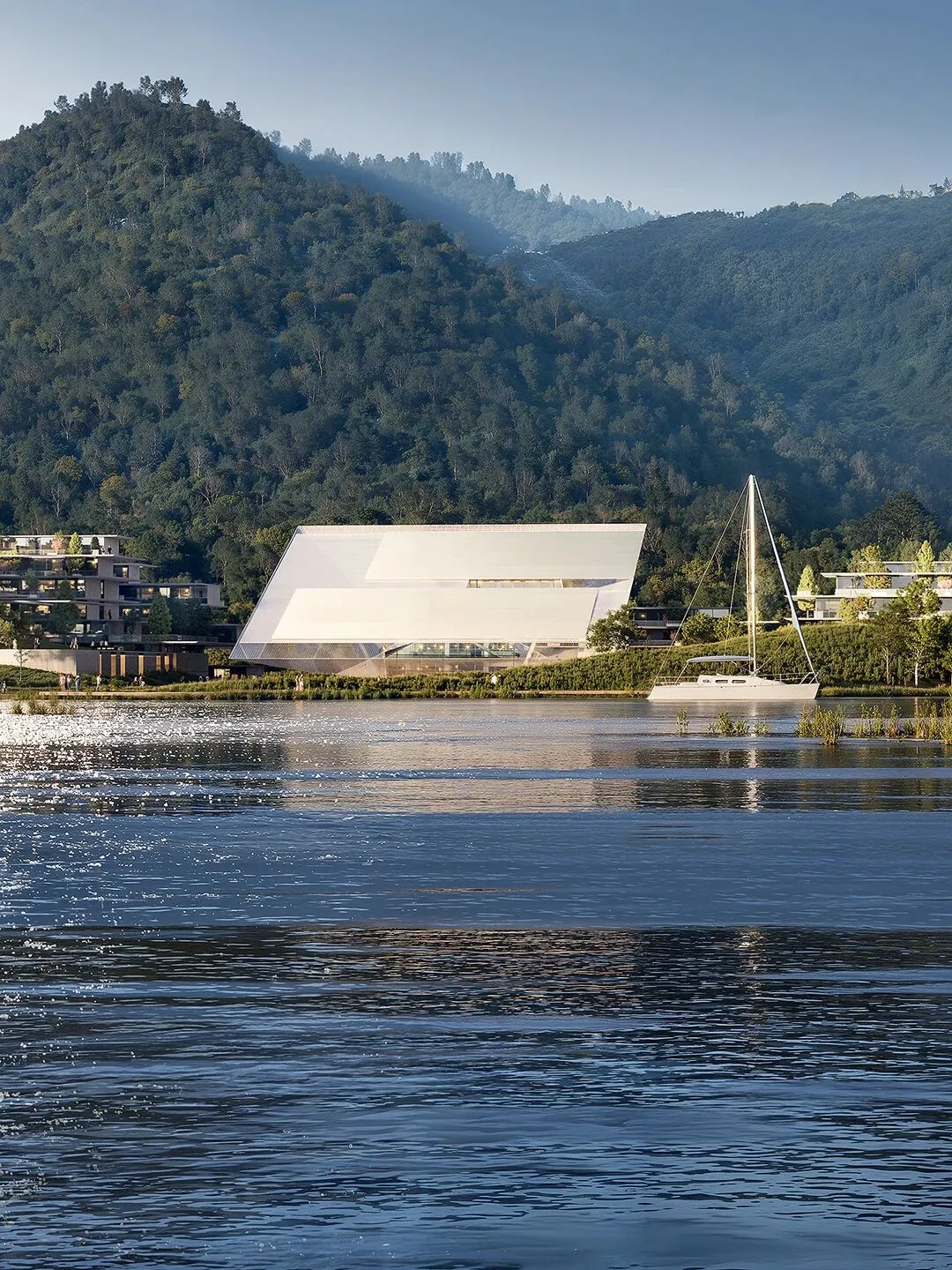方案打破传统的养老社区框架,而是以“生命方舟,智慧母舰”为灵感,让艺术、未来感与AI无声交融。台安湖成为整个布局的心脏,围绕它缓缓展开“一镇、一谷、两园”的格局。建筑顺应山势起伏,曲线与直线轻声对话,犹如从森林中生长出来,又轻轻悬浮于树梢之上,呼应着重庆独有的山城记忆。