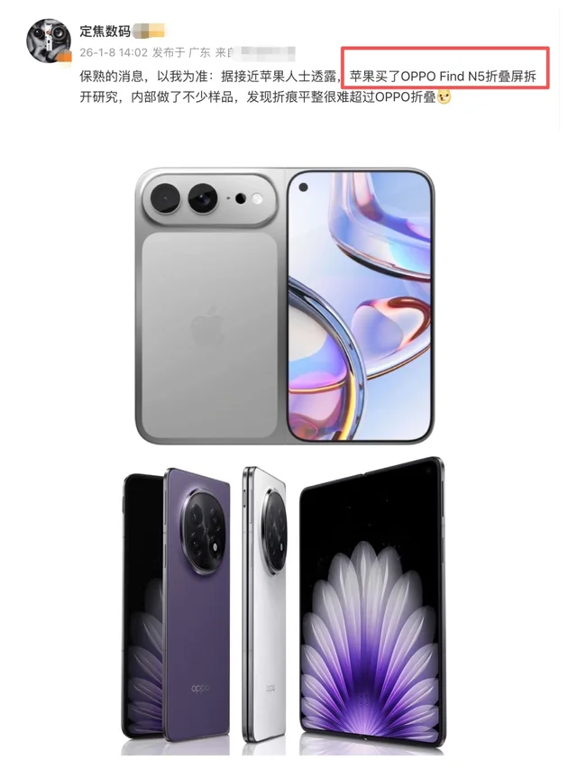 然而,作为后来者的苹果,在攻克“折痕”这一核心体验关卡时,似乎遇到了挑战。近期,多家科技博主爆料称,苹果研发团队为寻求技术突破,购入了多台OPPO Find N5进行详细的拆解研究,以分析其铰链设计与屏幕平整度控制方案。对比结果令苹果工程师感到“难绷”——自家样机的表现仍不及对手。