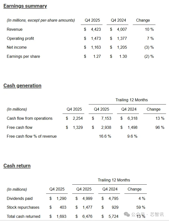 根据财报显示,德州仪器2025年第四季营收同比增长10%至44.2亿美元,环比下滑7%,略低市场预期的44.4亿美元,主要受智能手机、PC及平板电脑等消费类电子产品需求疲软拖累;净利润同比下滑3%至11.6亿美元;每股收益由去年同期的1.30美元降至1.27美元,同比下滑2%。