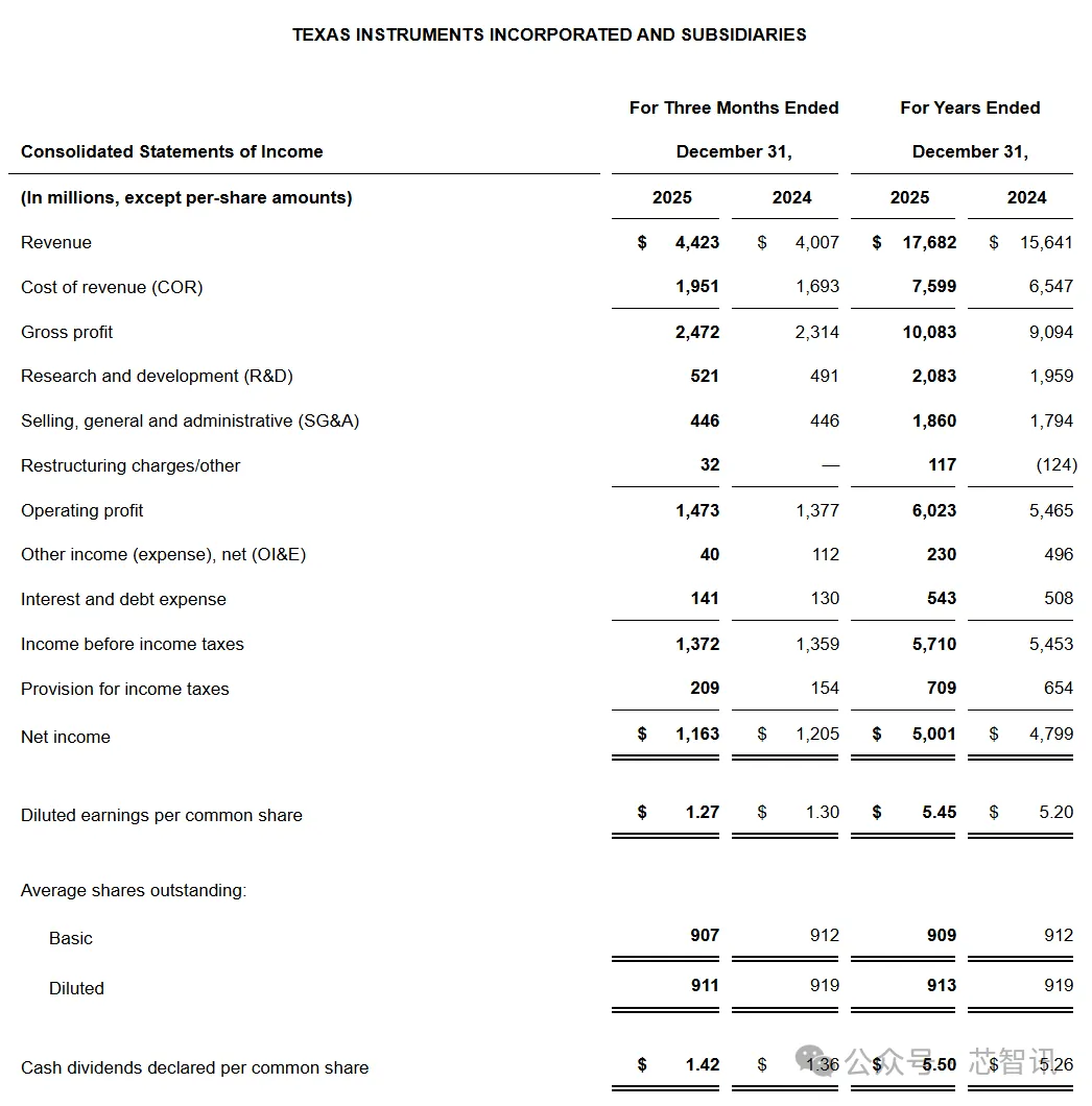 从2025年全年来看,德州仪器营收为176.82亿美元,同比增长13%;净利润为50亿美元,同比增长4.25%;每股收益为5.45美元,同比增长4.8%。
