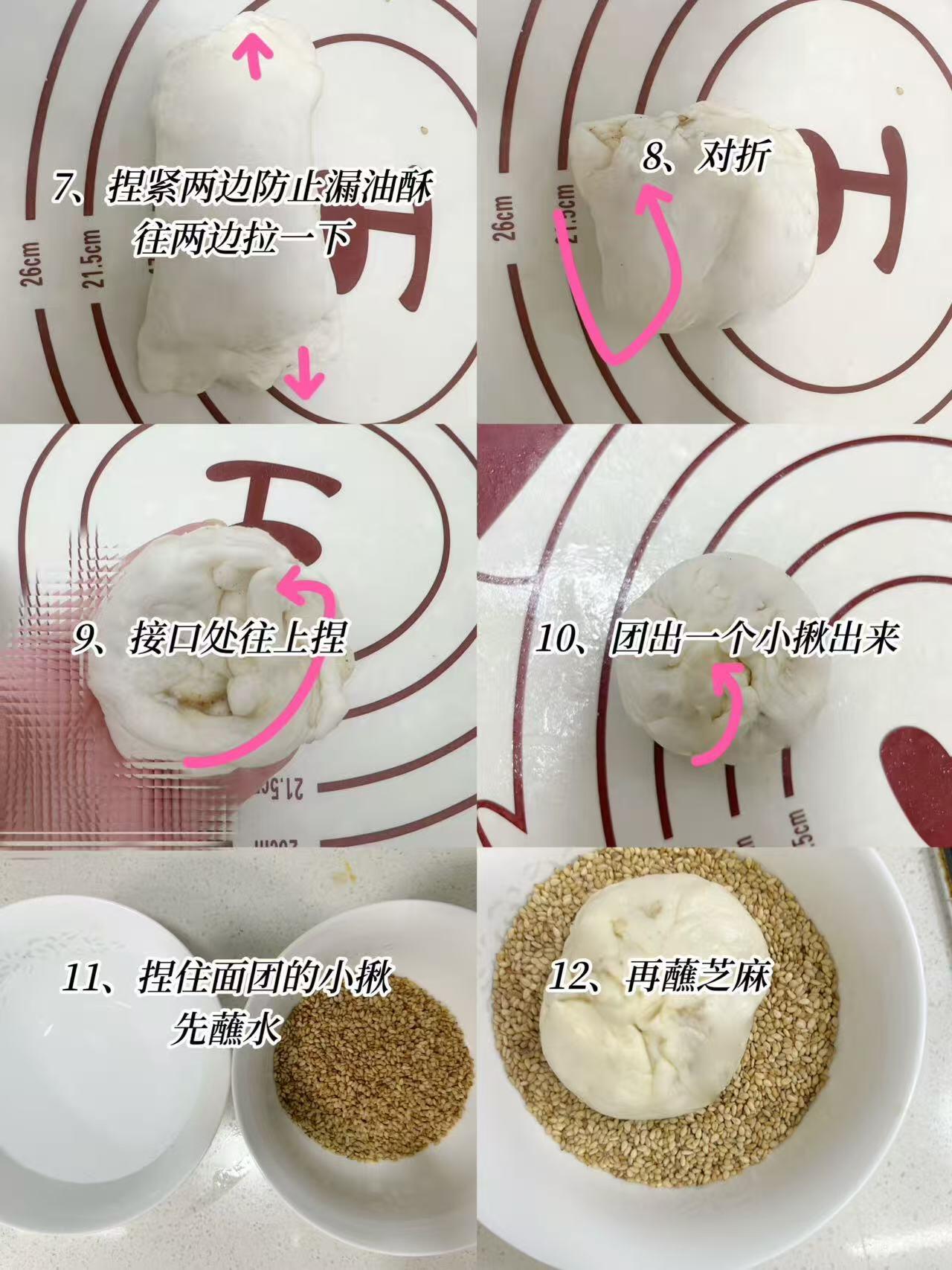 3. 取一个小面团,捏紧两头防止漏油酥,再往两边拉一拉,对折(像叠被子),接口处往上捏,团成圆面团,顶部揪出一个小揪揪(等下蘸芝麻用)。👉层次秘诀:卷的时候一定要紧,叠的时候别用力压,蓬松的面团才能烤出“千层酥”!