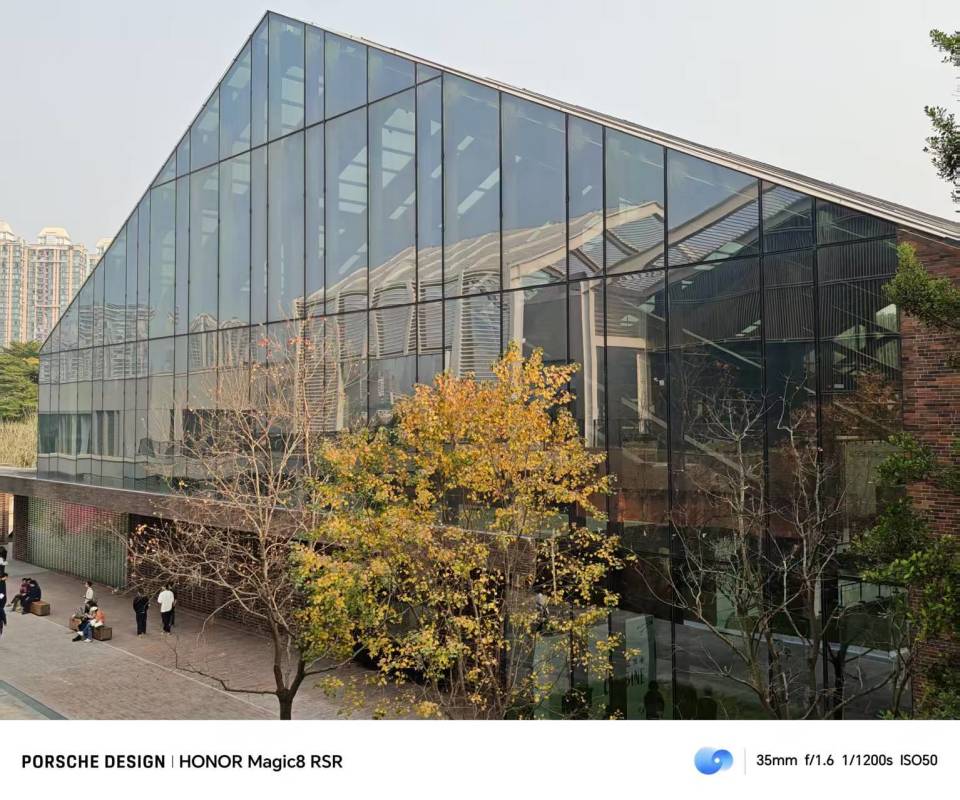 在玻璃房的场景里,同时出现翠绿交杂枯黄的树木、深红色的砖墙以及蓝天,在这种复杂的场景里,荣耀Magic8 RSR保时捷设计也没有出现明显的偏色问题。