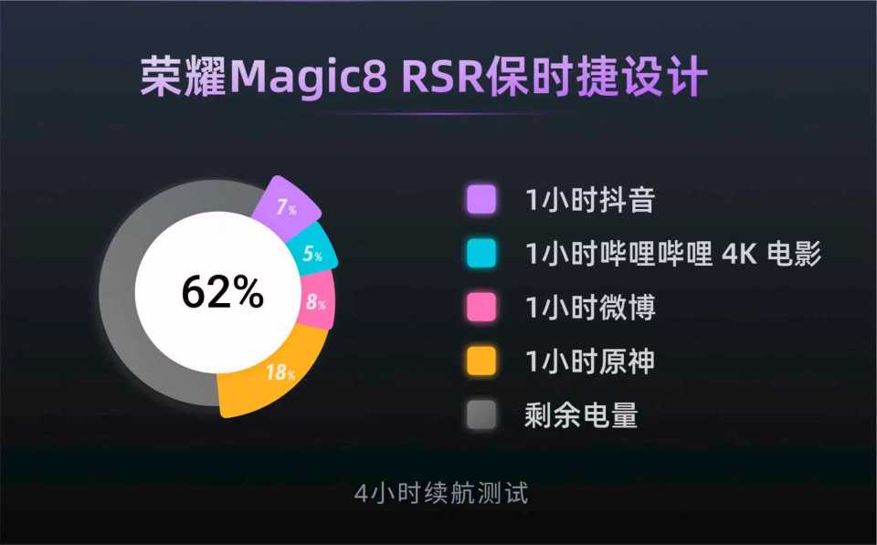 在续航方面,荣耀Magic8 RSR保时捷设计配备7200毫安时青海湖电池。虽说现在8000毫安时、10000毫安时超大容量电池的新机已经很多,但作为超大杯,7200毫安时电池也算是非常巨量了。实际续航表现来看,荣耀Magic8 RSR保时捷设计高耗电场景集中在1小时《原神》,耗电量达到18%;而日常的刷短视频、微博、看电影这些场景,耗电量基本都在5-8%之间,算正常表现。