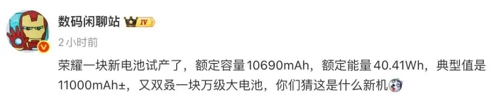 另外,最近的消息还显示,荣耀一块新电池试产了,额定容量10690mAh,额定能量40.41Wh,典型值是11000mAh±。爆料中没有提到具体的产品应用信息,但此前荣耀已经推出过多款万级大电池手机了。