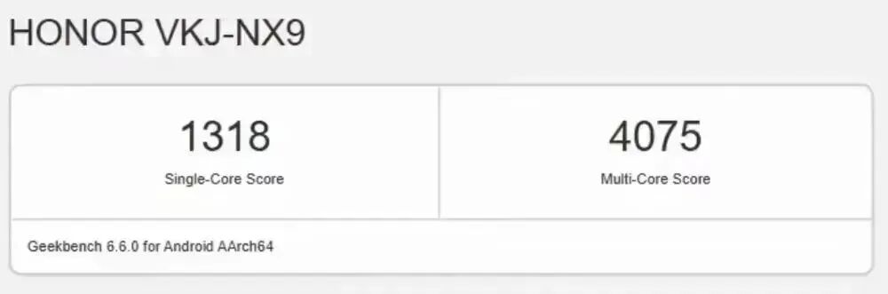 此外,一款型号为 VKJ-NX9的荣耀旗下新机在近日现身了 GeekBench 跑分。认证列表中并未显示具体的产品系列信息,但相关推测认为其指的是荣耀 600 手机。在 GeekBench 6.6.0 版本中,单核成绩 1318 分,多核成绩 4075 分。