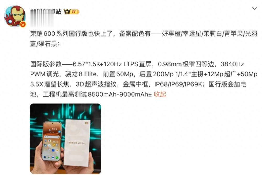 今天,博主@数码闲聊站 的爆料中提到,荣耀600系列国行版也快上了,备案配色有好事橙、幸运星、茉莉白、青苹果、光羽蓝、曜石黑等。
