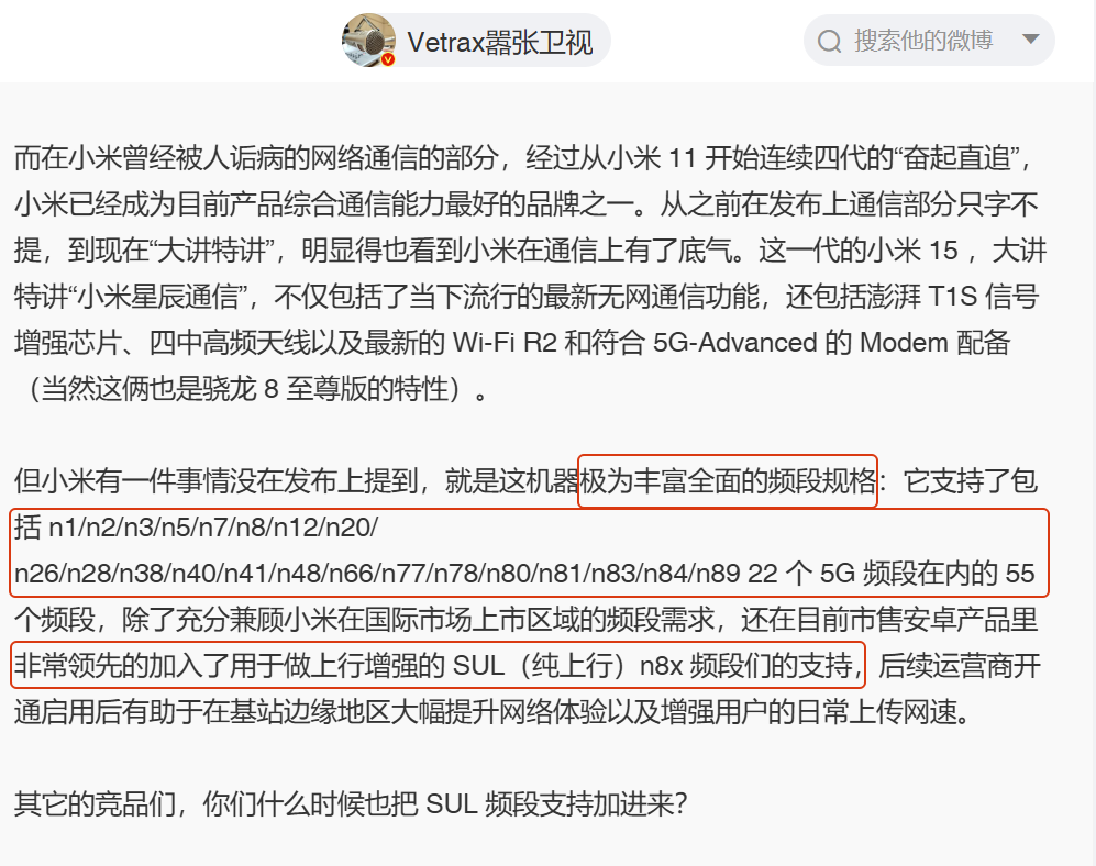 另外,在通信部分,小米15的5G频段是3款机型中最多的,这一点对于经常出国或者留学的朋友来说是非常友好的。
