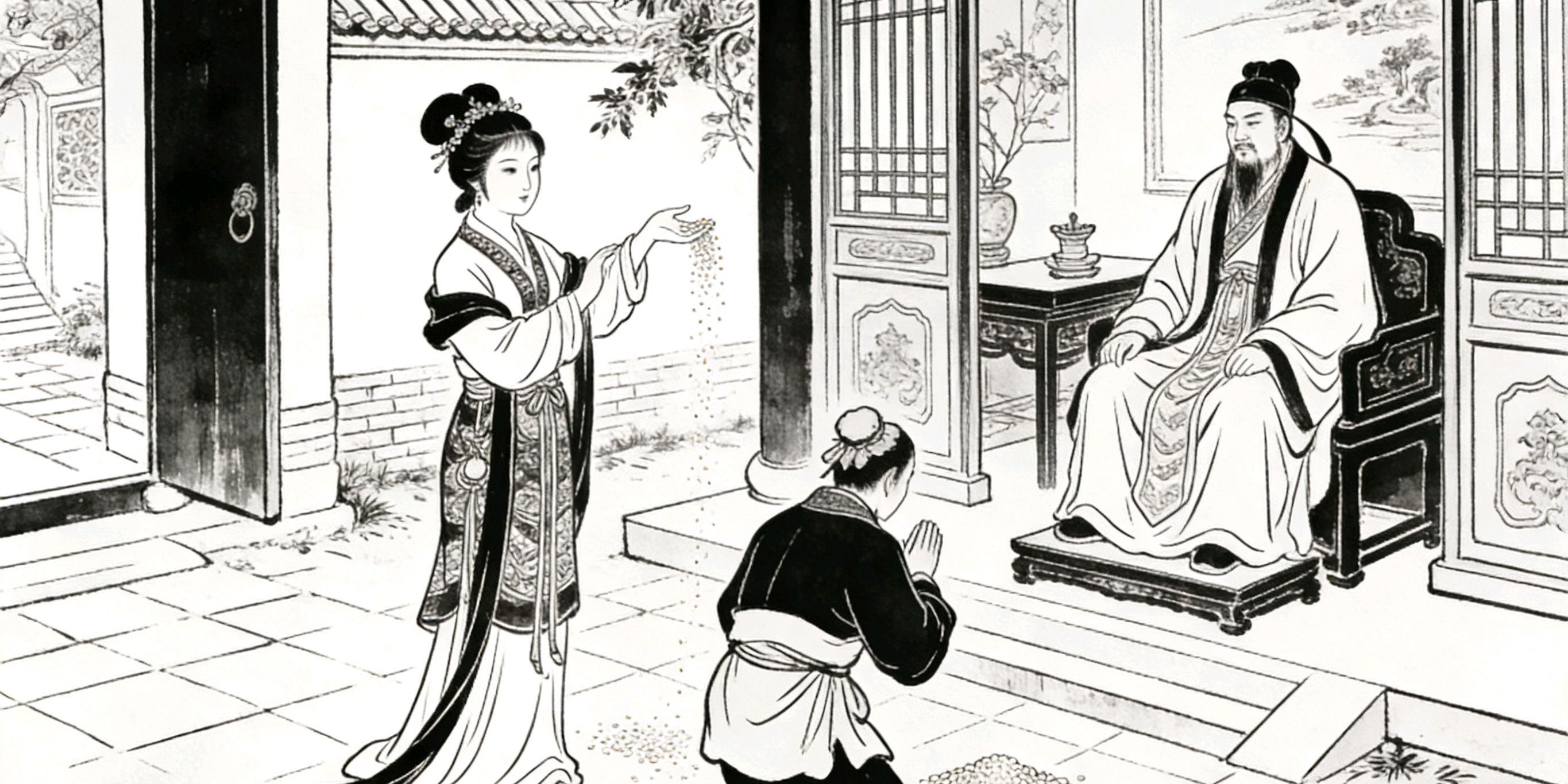 麻姑缓步走到庭院中,见阶前晒着半簸箕陈米,因时日已久,米粒干瘪枯黄,便伸手撮起一把,笑道:“贫道无甚礼物,便以此米相赠吧。”说罢,扬手便将手中米往庭院中撒去。
