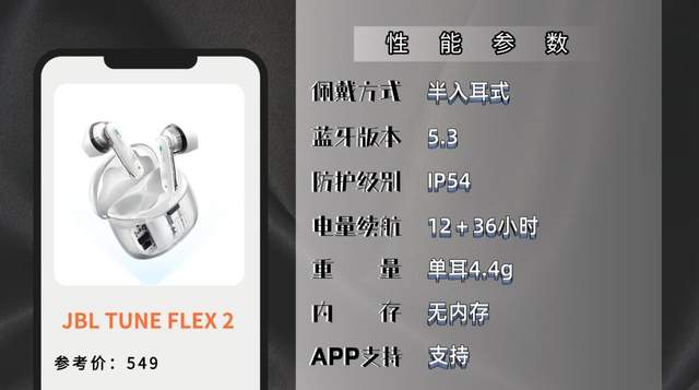 配置上,TUNE FLEX 2配备高性能蓝牙5.3芯片,连接稳定且低延迟,可同时连接两台设备并轻松切换。续航方面表现优异,耳机单次可使用约10小时,充电盒额外提供约30小时续航,总续航约40小时,支持快充,充电10分钟即可续航约3小时。同时IP54防水防尘设计让日常使用更放心,无论是汗水、雨水还是偶尔泼溅都不用担心。整体来看,JBL TUNE FLEX 2兼具舒适佩戴、长续航和清晰音质,适合追求轻便与高效使用体验的用户。