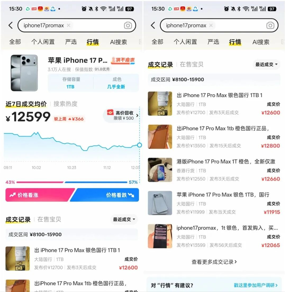 以 1TB 的 iPhone 17 Pro Max 为例,近七日成交均价仍在 12599 元 左右,与全新未拆封机的价差并不大。这也从侧面反映出,Pro 系列在用户心中的认可度和耐用度依旧在线。