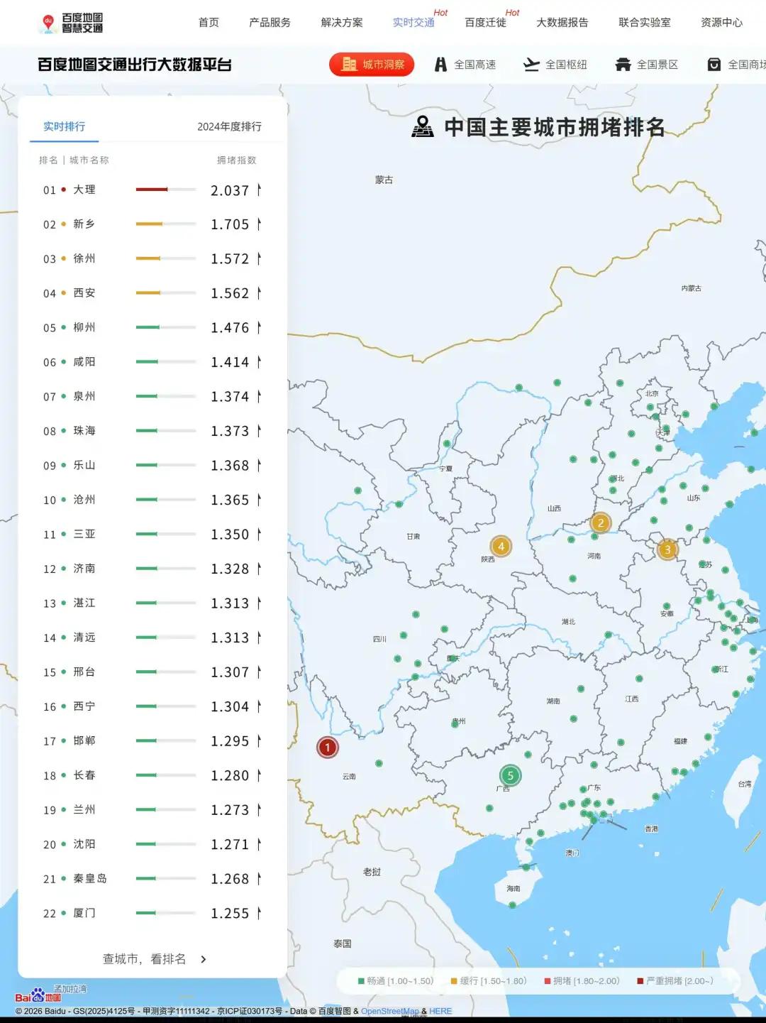 大理以2.037的拥堵指数位列全国首位,是唯一拥堵指数突破2.0的城市,达到“严重拥堵”等级。新乡、徐州、西安、柳州、咸阳依次位列第二至第六,拥堵指数在1.414-1.705之间,处于“缓行”至“拥堵”区间。泉州、珠海、乐山、沧州等城市进入前二十,涵盖旅游城市、工业城市、交通枢纽城市等多种类型。