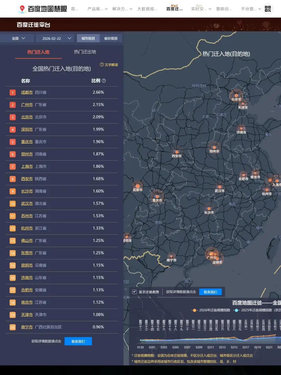 2月22日全国热门迁入地中,成都市以2.66%的迁入比例居首,广州市2.15%、北京市2.09%、深圳市1.99%、重庆市1.96%,位列前五。郑州市、上海市、西安市、长沙市、武汉市等新一线城市及省会城市,迁入比例均在1.5%以上。