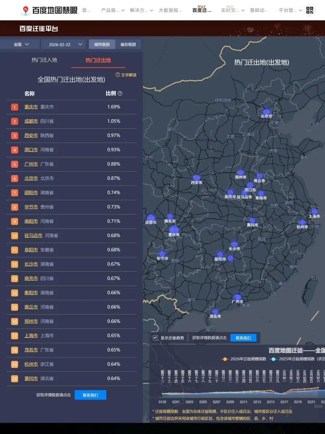 2月22日全国热门迁出地数据显示,重庆市以1.69%的迁出比例位列首位,成都市以1.05%位居第二,西安市以0.97%排名第三。周口市、南阳市、驻马店市等河南中部城市,邵阳市、长沙市等湖南城市均进入前二十,迁出比例在0.64%-0.93%之间。