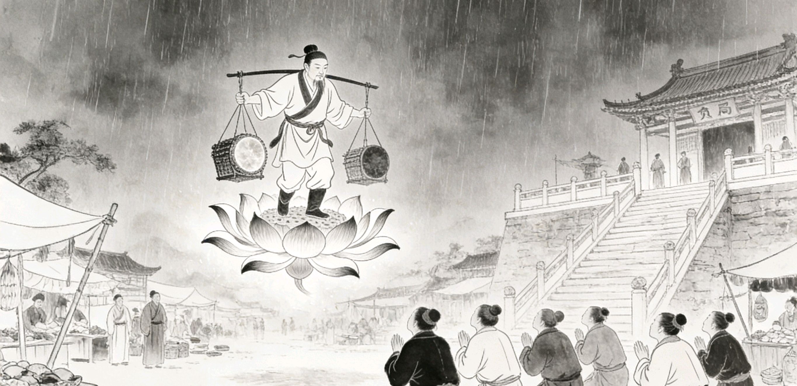 如此过了数年,负局先生的名声传遍了吴郡,人人都道他是活神仙。这年盛夏,吴郡一连半月滴雨未下,田地龟裂,禾苗枯死。百姓们跪在城隍庙前焚香祷告,哭声震天。忽一日,天空乌云密布,雷声滚滚,一场瓢泼大雨倾盆而下。百姓们欢呼雀跃,奔走相告。就在此时,有人瞧见那磨镜的老翁,竟立在集市的高台上,身形渐渐悬空而起。