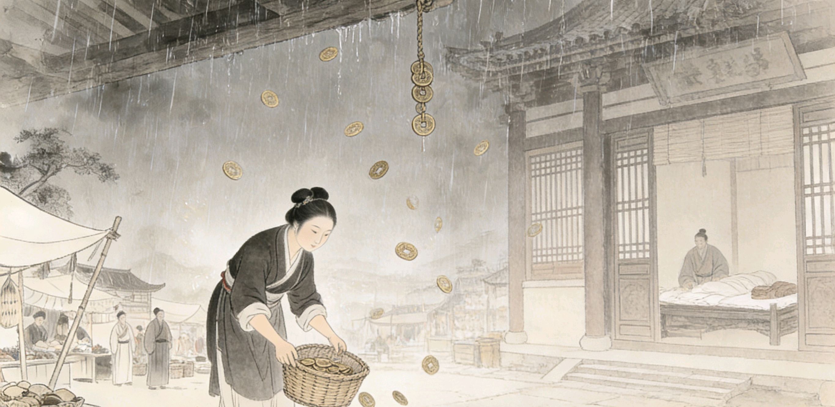 消息一传十,十传百,满城的百姓都涌到街上,争相捡拾。城南有个贫妇,姓李,丈夫早逝,只留下她和一双年幼的儿女,平日里靠纺线织布勉强糊口,日子过得十分拮据。见此奇景,李妇也顾不得淋雨,拿着竹筐跑到街上,埋头捡拾铜钱。不多时,竹筐便装得满满当当。她喜极而泣,抱着竹筐跑回家中,小心翼翼地将铜钱倒在床下,又搬来石块压住,生怕被人偷了去。