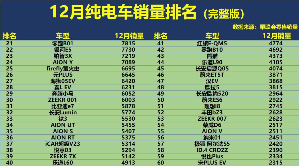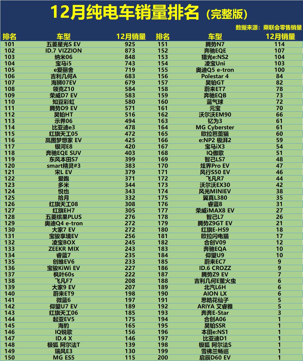 又是大败!12月纯电车销量战报:超百款不足千辆,小米YU7亚军!