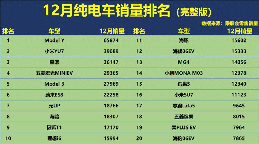 根据最新消息获悉,2025年12月份国内纯电车销量排行出炉,令人意外的是,12月份纯电车市场并未迎来爆发,反而是遭遇了爆冷,仅有16款车型破万,相较11月份大幅减少。特斯拉Model Y以超过6.5万辆稳居第一,小米YU7冲至亚军位置,其同门轿车小米SU7也进入了榜单前列。经典车型如五菱宏光MINIEV、Model 3、海鸥等,凭借稳定的市场定位,依旧保持着可观的销量。榜单中后段则充满了变数,例如蔚来ES8排名靠前,而定位相似的理想MEGA销量却未达预期。惨淡!12月纯电车销量:破万车型仅16款,Model Y回榜首,海鸥第8!