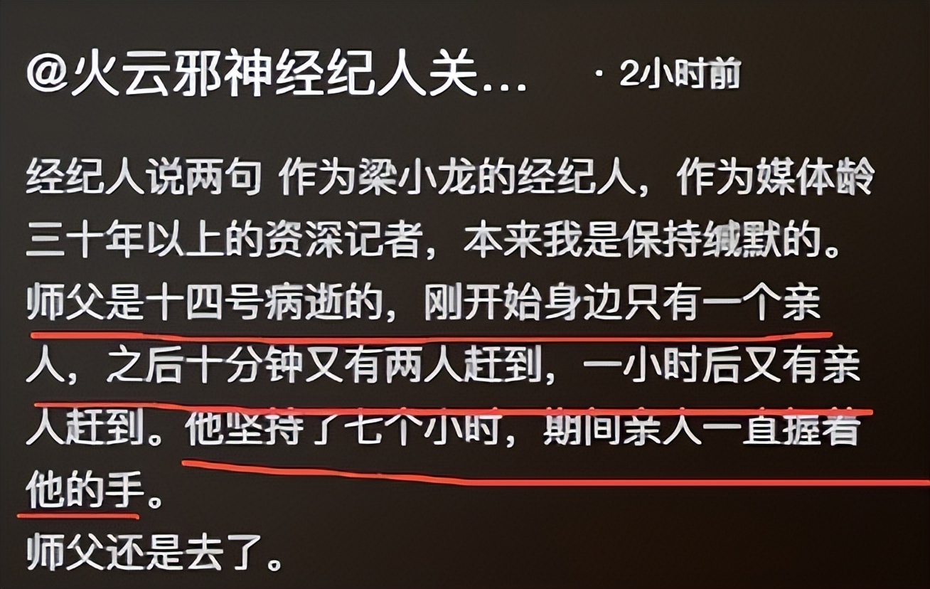 原本这位经纪人是保持缄默的,但无奈被“大嘴巴”泄密后,只能站出来说两句。他称梁小龙是14号病逝的,一开始身边只有一个亲人,10分钟后又有两人赶到,1小时后又有一批亲人赶来。梁小龙足足坚持了7个小时,期间亲人一直握着他的手。