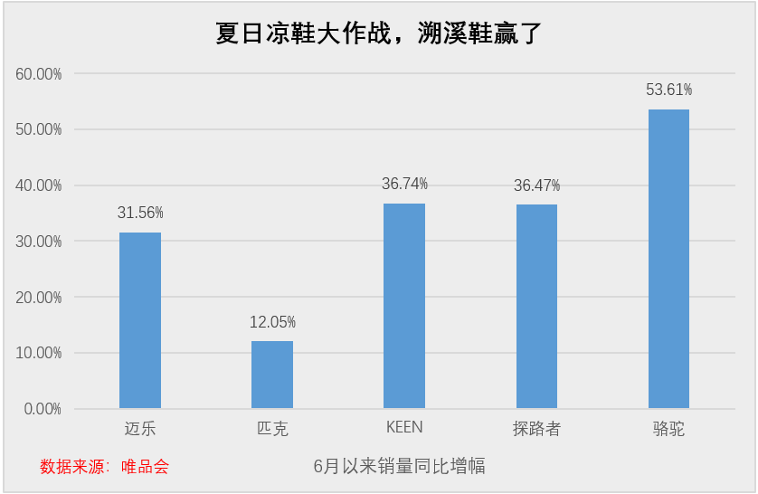 市场数据印证着这股热浪。特卖电商唯品会数据显示,今年6月以来,溯溪鞋的销量比去年同期猛增了 50%。其中 KEEN、探路者、迈乐、匹克这些有名的品牌,销量增长都在两位数以上,骆驼品牌的溯溪鞋同比增长更是高达 53.61%。