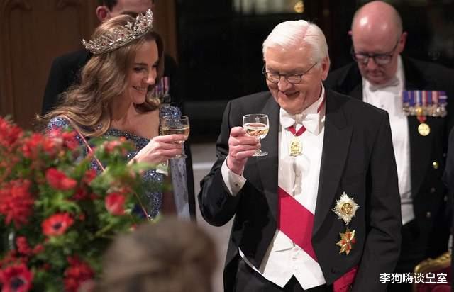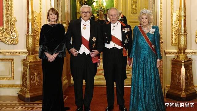 王室接待德国总统弗兰克 - 瓦尔特・施泰因迈尔与第一夫人埃尔克・布登本德时,卡米拉王后身着菲奥娜・克莱尔(Fiona Clare)设计的青绿色蕾丝礼服,威尔士王妃则穿了一件詹妮・帕克曼(Jenny Packman)品牌的亮面冰蓝色礼服。