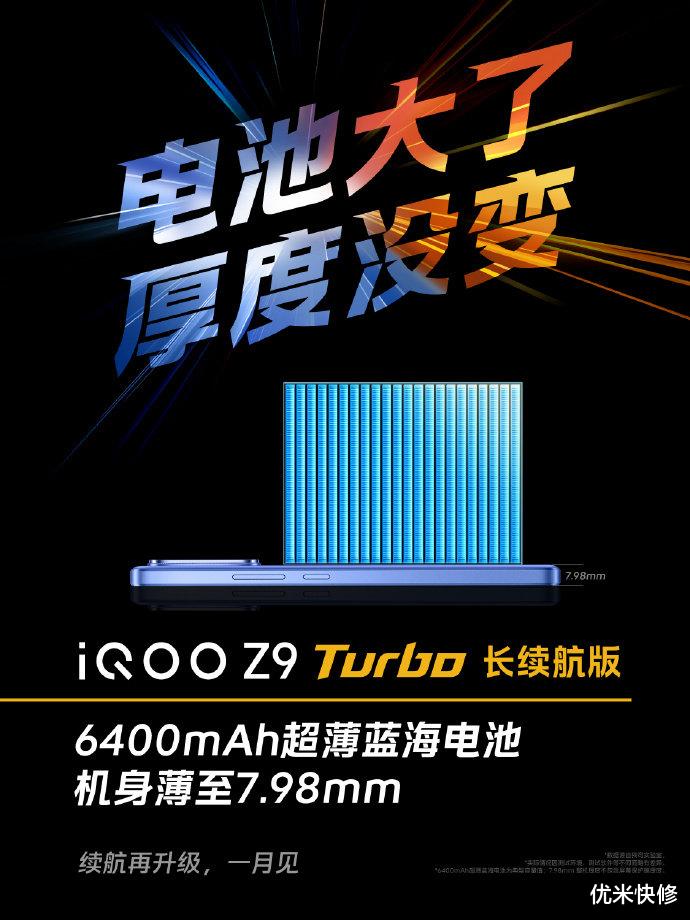 1 月 2 日,iQOO Z9 Turbo长续航版即将开售,这次的「长续航」在于,电池容量增加到 6400mAh,并且厚度还能保持在 7.98mm,给你满满的安全感。