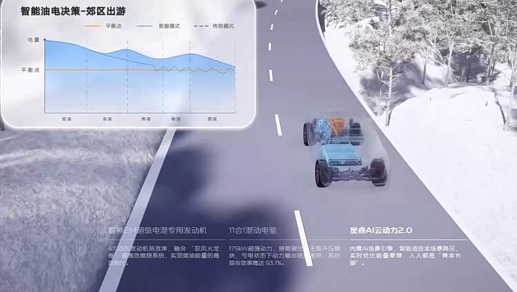 动力与油耗的平衡也做得出色。1.5L发动机+175kW电机的组合,零百加速7.3s,超车、爬坡动力十足;雷神AI电混2.0系统加持,发动机热效率47.26%,电驱综合效率93.1%,CLTC亏电油耗3.15L/100km,比很多小型燃油车还省油,兼顾驾驶乐趣与用车成本。