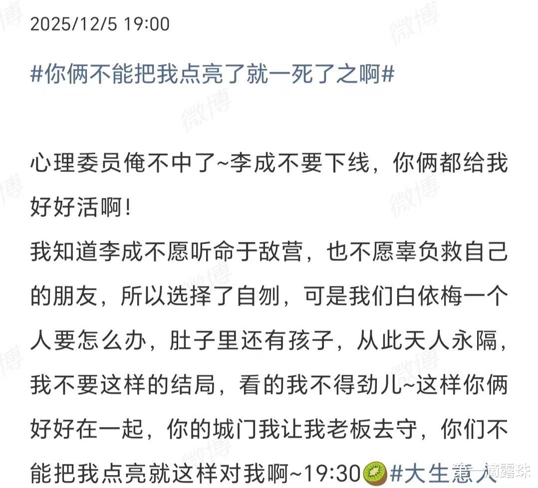 李成下线,白依梅李成夫妻生死别离,大部分观众虽然一开始时就知道会是这种结局,但还是表示了伤心、惋惜和意难平。