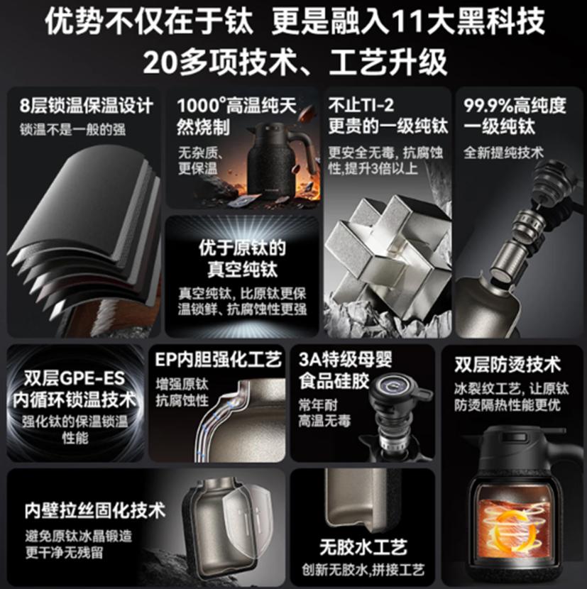 这些主要得益于它独特的 “八层锁温设计” 和 “GPE-ES 内循环锁温技术”,配合全壶体99.9%高纯度Ti-1材质,把热量损失降到了最低。