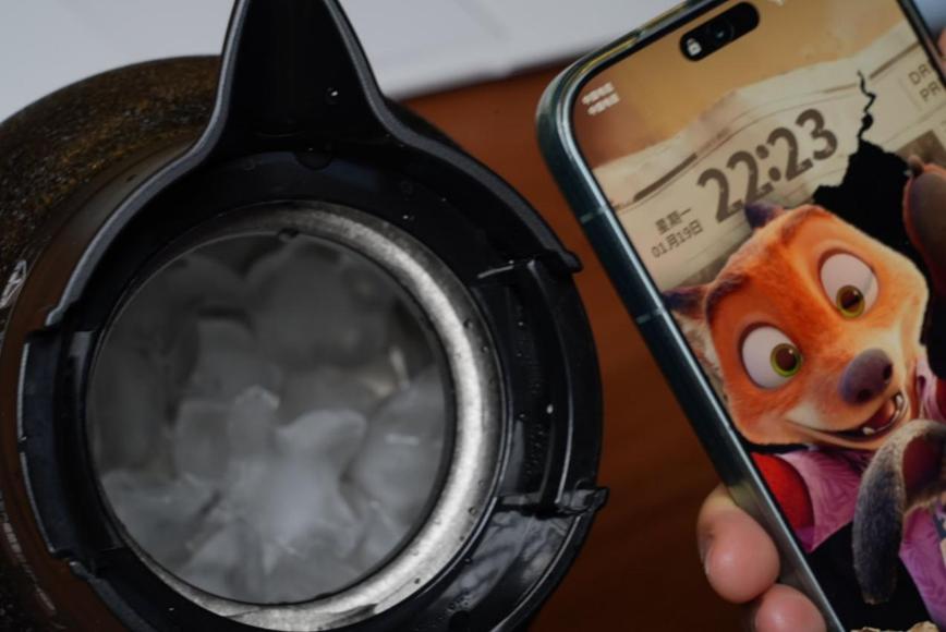 在有小朋友的家庭中防烫与防漏也是相当重要的,试了一下,壶内装着100℃沸水,无论怎么上下倾倒,盖子处都滴水不漏。防烫是靠 “双层防烫技术” 结合 “冰裂纹工艺外胆” 实现的隔热效果,而超强的密封性则来自高精度设计的盖子和高纯度钛材的契合度。