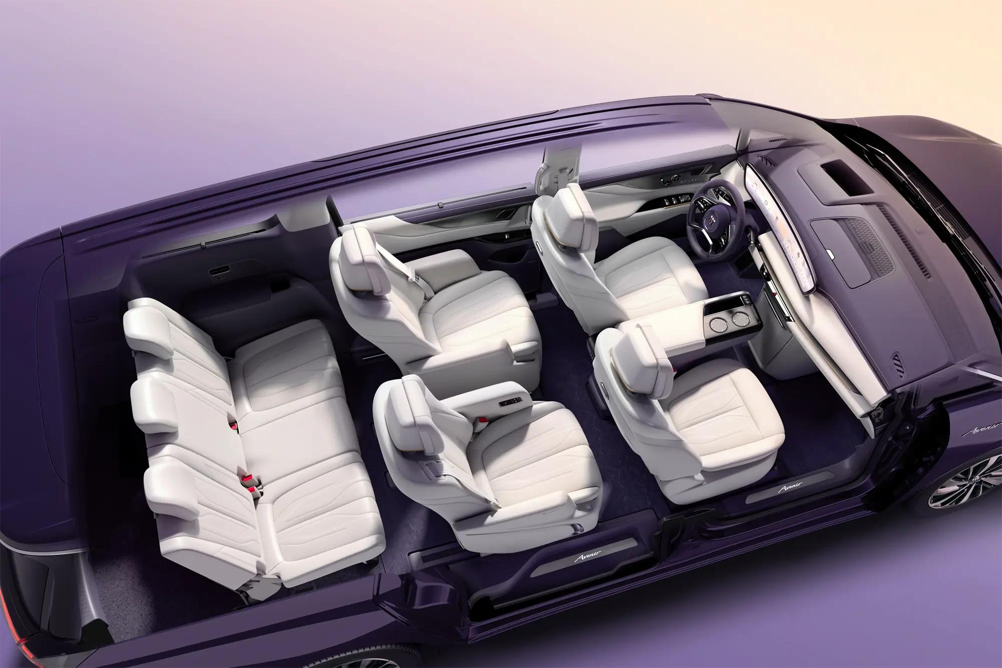 陆尊的外观更具仪式感,融入第三代艾维亚设计美学,主打“紫气东来,向上生长”的意境,适配商务和家庭重要出行。车身线条舒展,细节处的礼宾设计很有质感,2.8米银翼礼宾光毯搭配礼宾律动光语和128色氛围灯,晚上解锁时仪式感拉满。