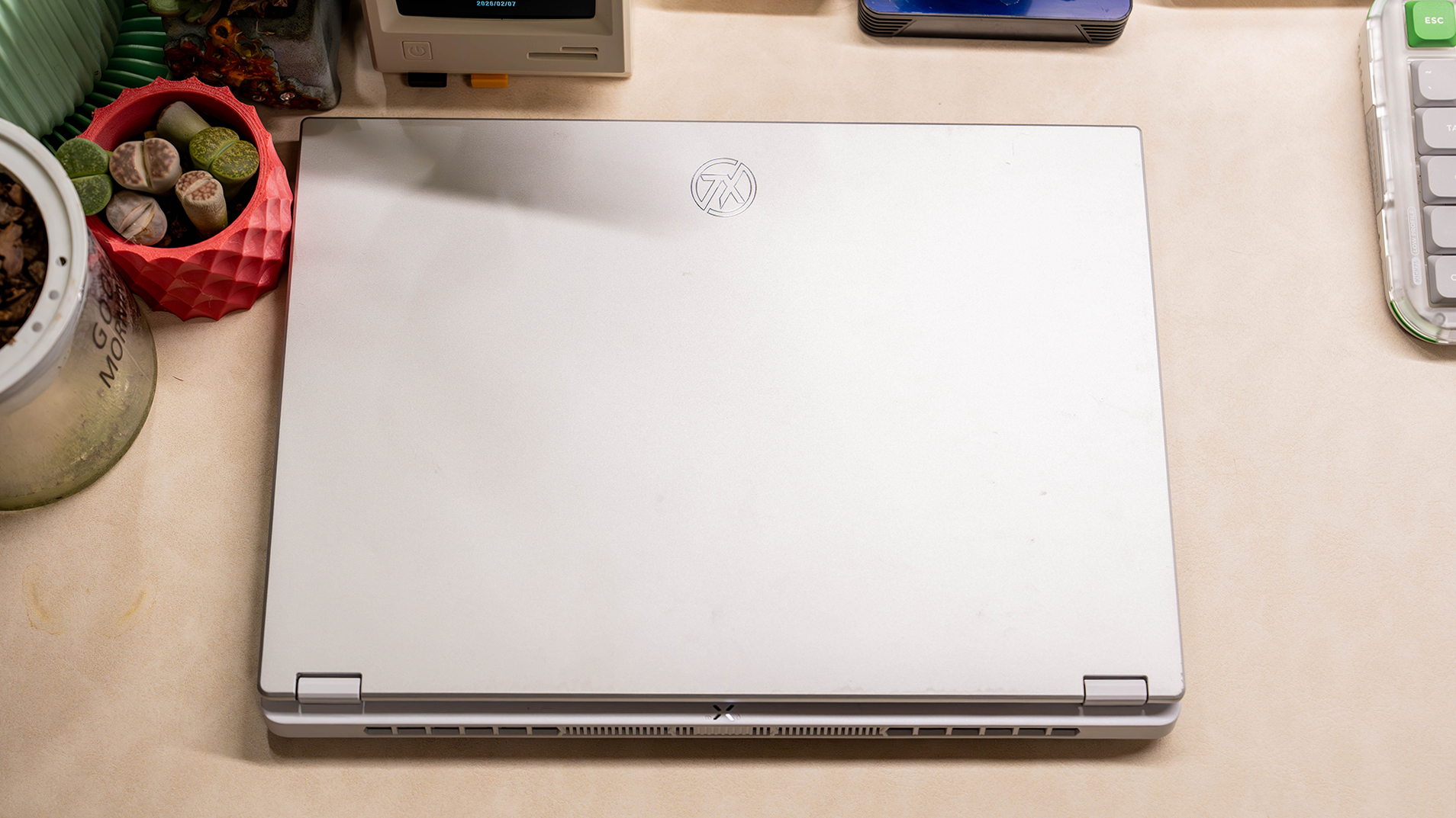 华硕天选 Air 2026,一共分为了两个颜色,一个是深色系的日蚀灰、一个是浅色系的月光银。我们手头的这款,就是月光银色!它的AD面为金属材质,整体的重量控制在了1.46KG左右,走的是轻薄全能本的路线。