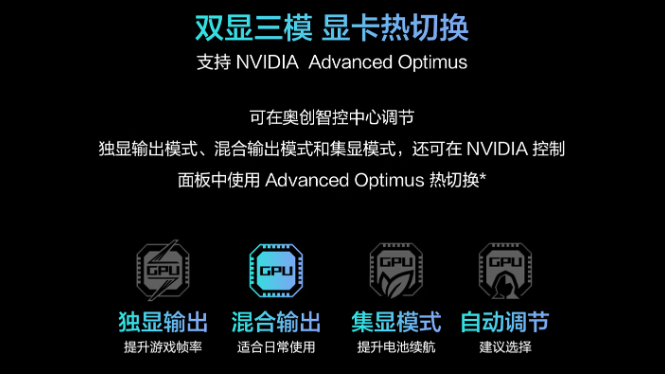 此外,它具备了显卡热切换模式,在日常工作时,我们可以使用集显获得最大的续航。遇到多媒体创作或是游戏,它不需要我们重启电脑进行显卡切换,直接在奥创中心智能调用即可,这一点,简直不要太方便。