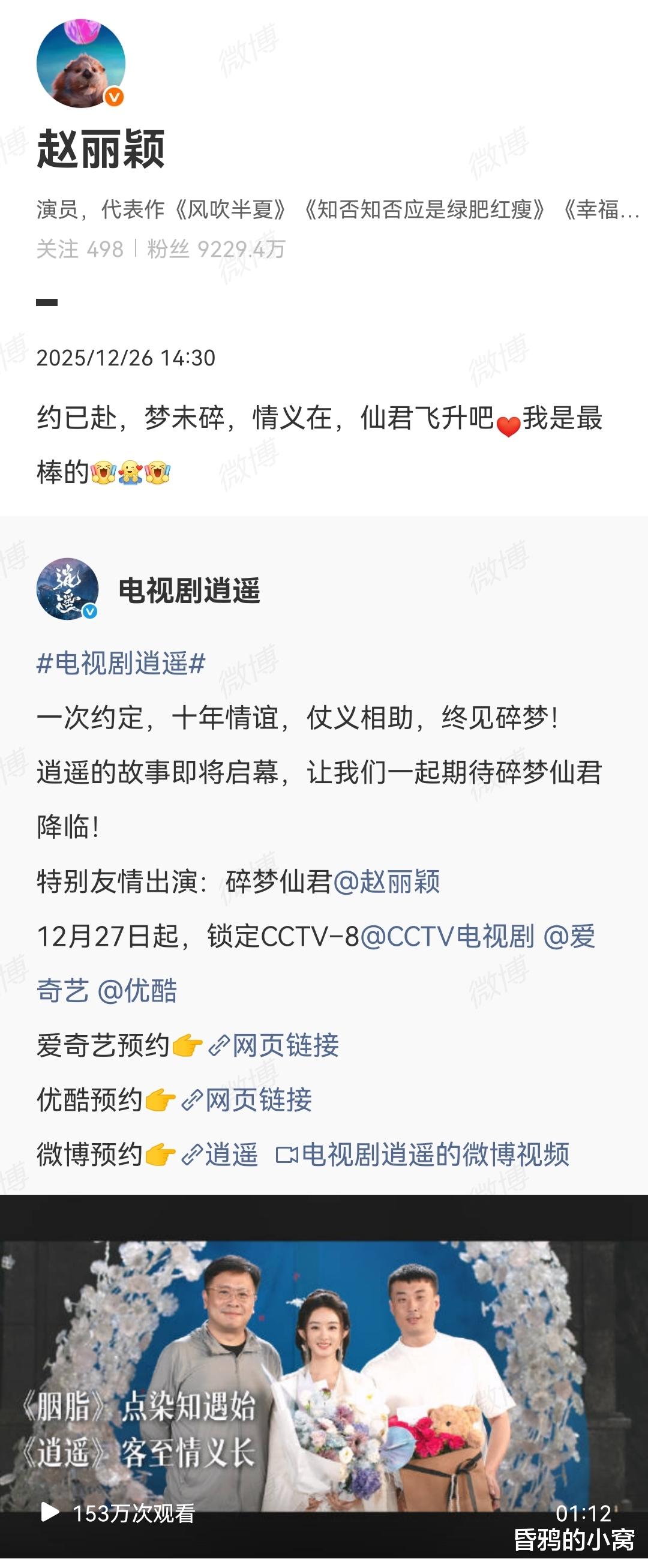 2025年12月27日,《逍遥》将登陆CCTV-8与两大网络平台,赵丽颖饰演的碎梦仙君将在第30集后正式登场,为这场跨越十年的约定画上最终句点。