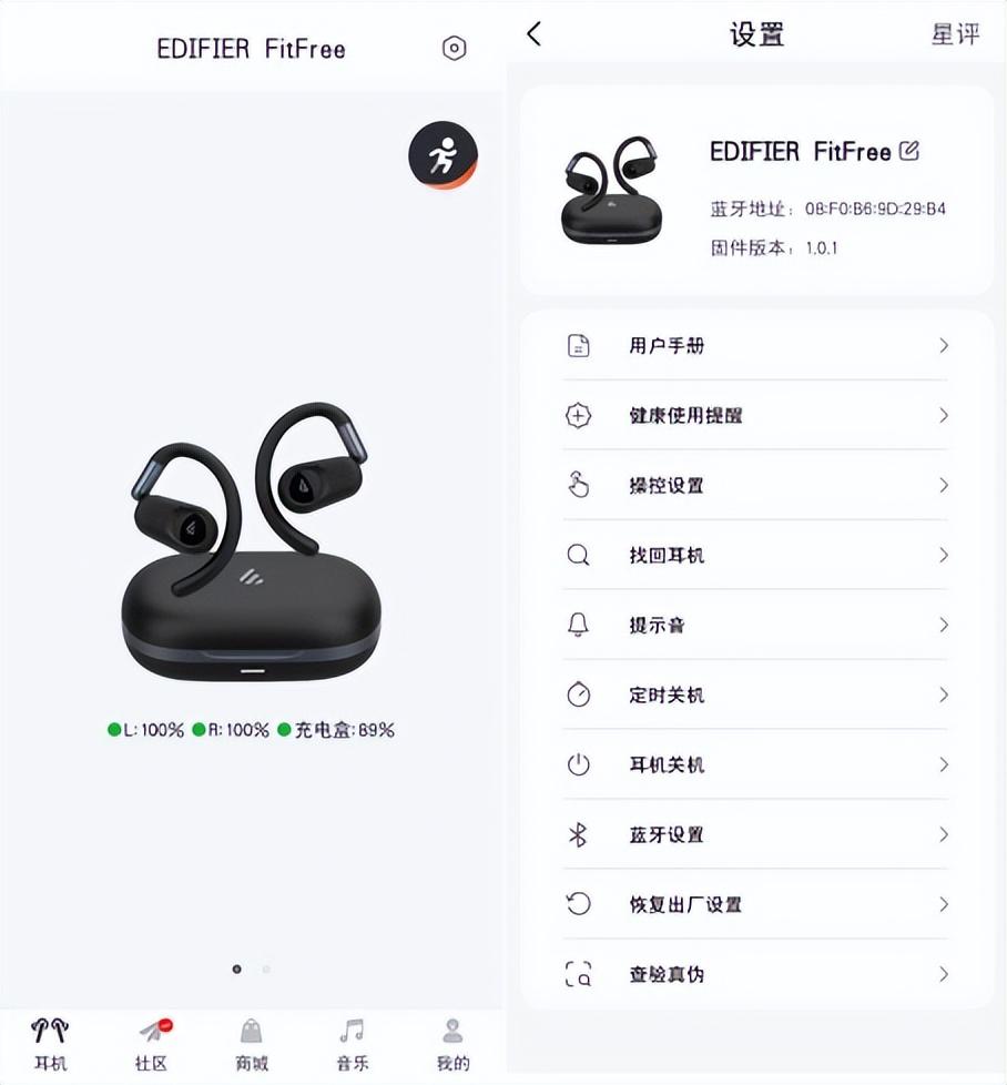 App个性化定制是漫步者(EDIFIER)FitFree另一大亮点,连接上耳机蓝牙后,打开EDIFIER Connect App约3秒即可自动跳转到FitFree的操控界面,免去了查找产品的步骤非常人性化。首页是耳机和充电盒的电量提示,非常直观,设置页的功能更加丰富,支持操控设置、耳机找回以及定时开关机等等,最重要的是FitFree还支持运动数据记录,这里不得不感叹一下,漫步者不愧是大厂,配套服务做的非常到位!
