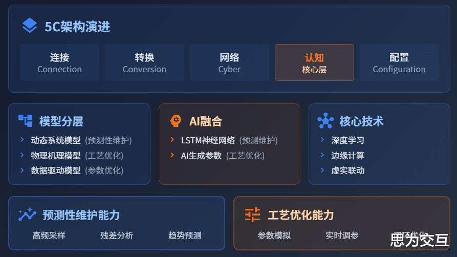 5C 架构的演进:传统的数字孪生架构包括连接(Connection)、转换(Conversion)、网络(Cyber)、认知(Cognition)和配置(Configuration)五个层次。在实现双驱动的过程中,认知层(Cognition)变得尤为重要。它不仅要处理海量的数据,还要进行深度的智能推理,支持预测性维护的算法和工艺优化的模拟。