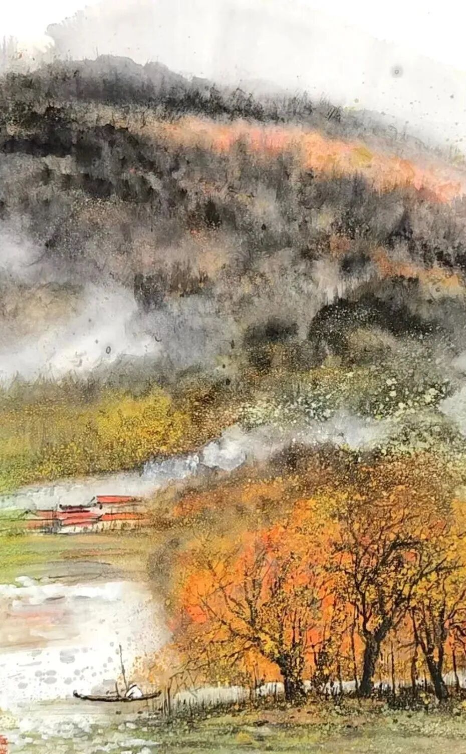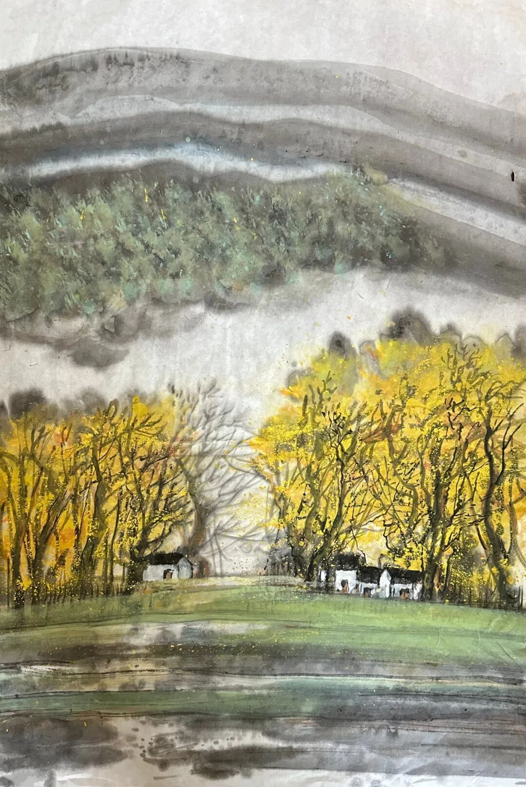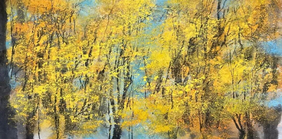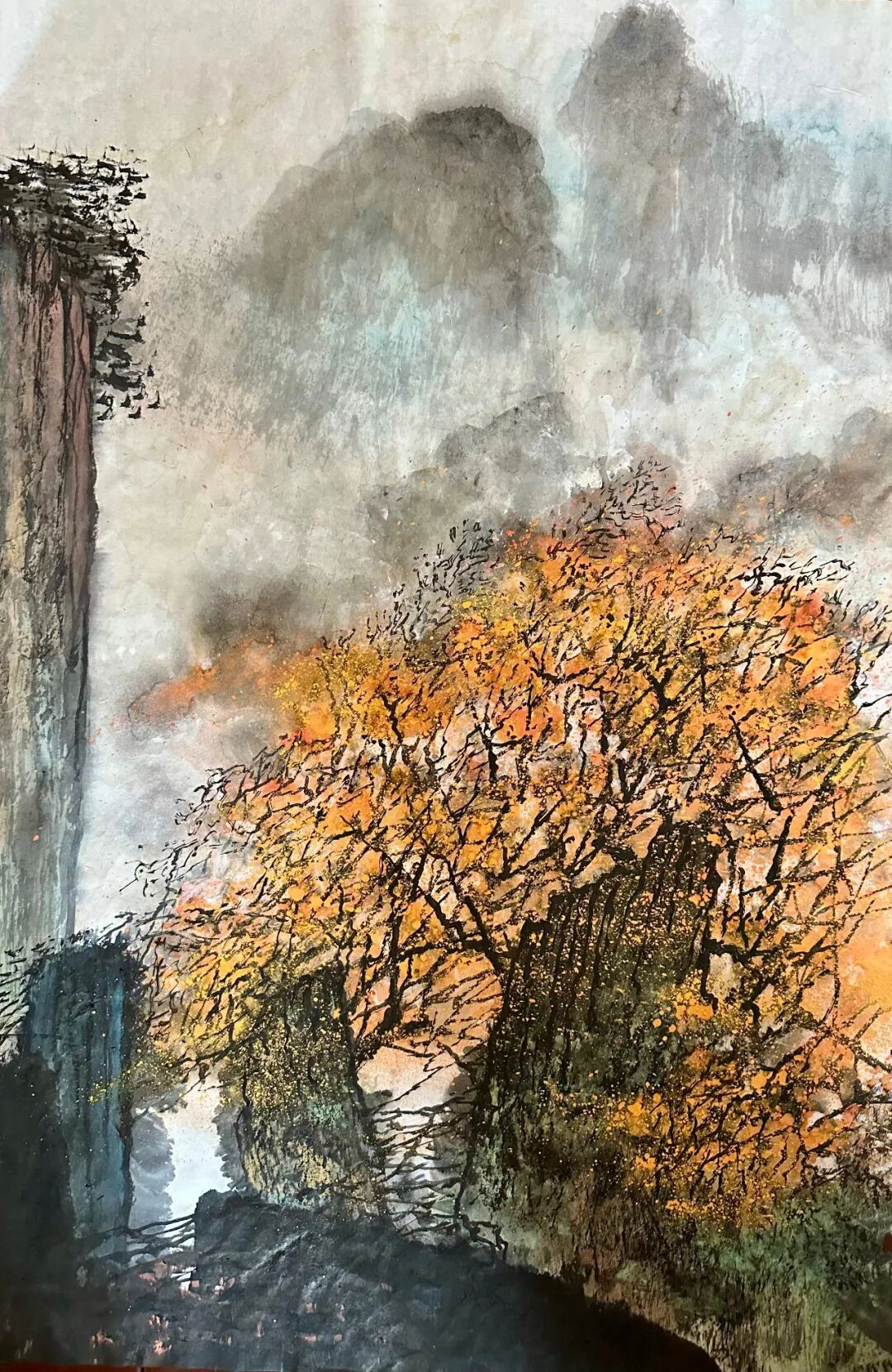 他最近又画了许多以江南为题材、以秋色为主调,融合油画的绚烂与水墨的氤氲,用洒彩、泼色、点降、描金等多种实验手段,结合撞墨、破墨、积墨等传统画法,特别注重笔墨之外的水法之运用,画面呈现金黃、深红、墨绿、淡褐等丰富多彩的色彩的和声与交响,把江南的秋色描绘得朗丽多姿,具有典雅的东方美学气息与西方现代构成的意蕴,体现"中西合璧"的艺术理念,晕染、营造出一幅幅朦胧的诗意景象。